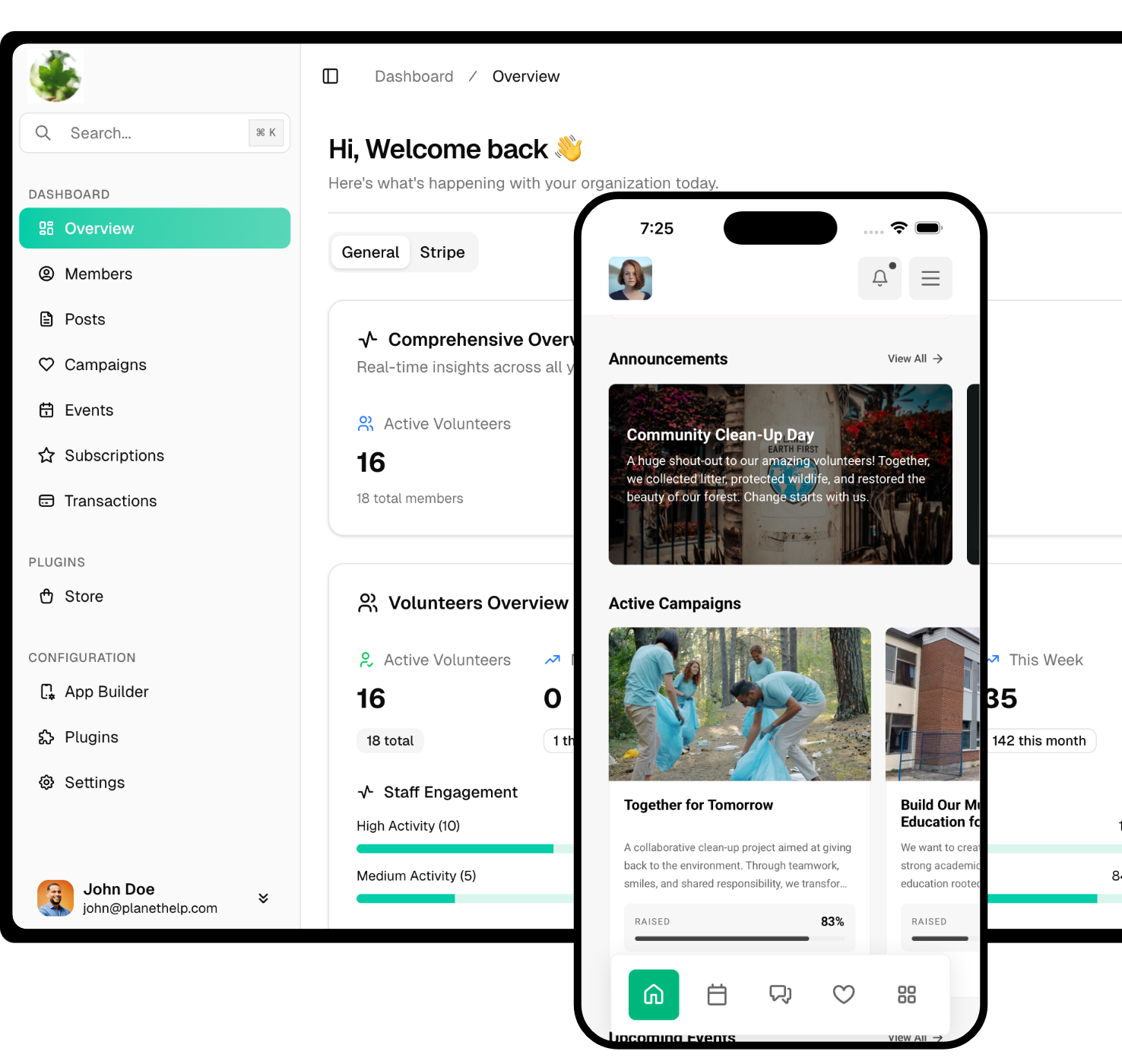 Manage donations, subscriptions, events, volunteers, and community engagement from one simple platform.